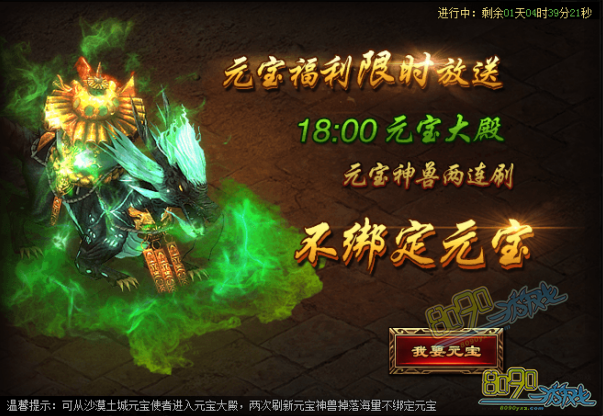 活动内容:活动期间,在沙漠土城元宝使者NPC处进入元宝大殿,将刷新元宝神兽,掉落海量不绑定元宝