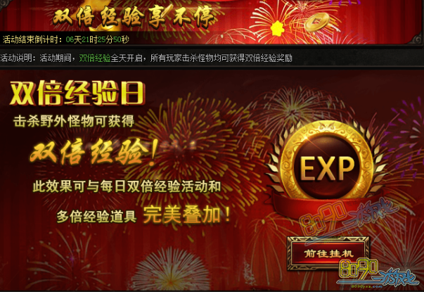 活动内容:活动期间,双倍经验全天开启,急速升级爽歪歪!