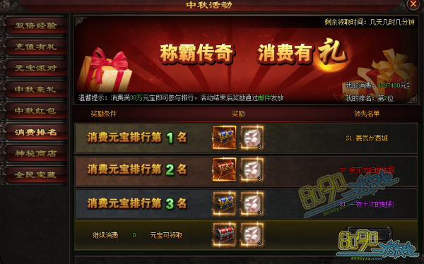 活动内容:活动期间,消费30万元宝即可进入排名,前3名玩家可获得稀有装扮奖励!