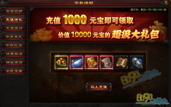 活动内容:活动期间,充值1000元宝即可领取价值10000元宝的超级大礼包!你心动了吗?