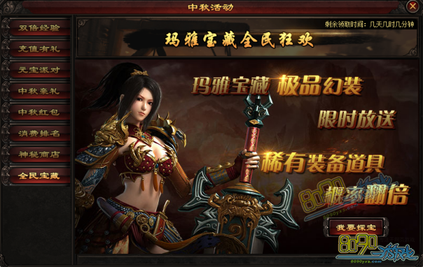 活动内容:活动期间,全民宝藏限时开启,极品道具限时翻倍产出,你不容错过!
