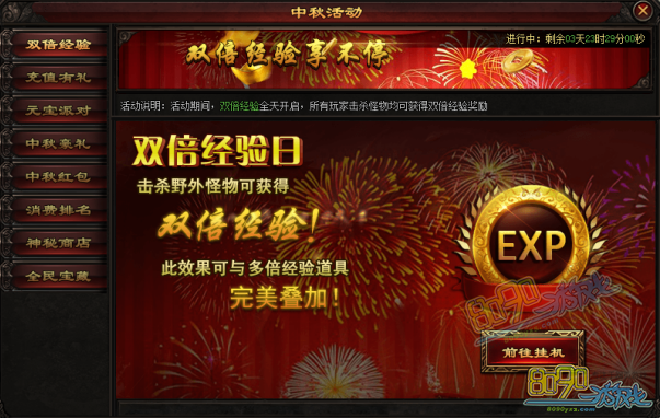 活动内容:活动期间,双倍经验全天开启,所有玩家击杀怪物均可获得双倍经验奖励,还能与多倍经验道具完美叠加哦!