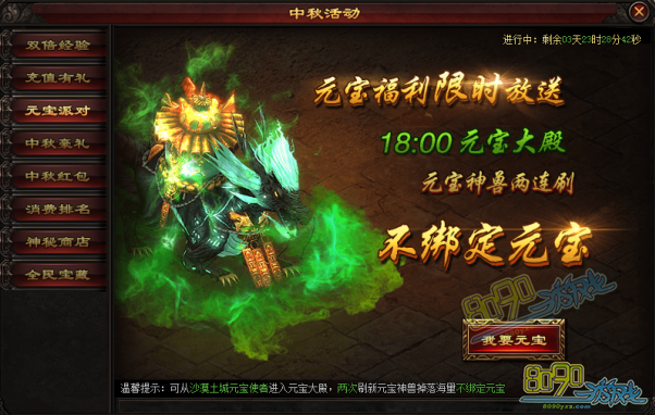 活动内容:活动期间,玩家进入元宝大殿击杀元宝神兽,将会掉落海量不绑定元宝。