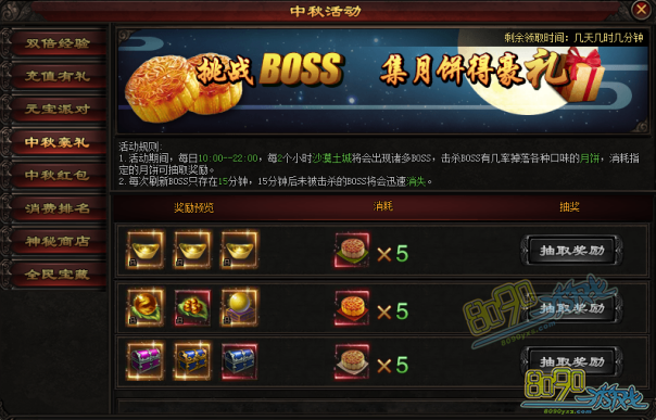 Ø 活动期间,每日10:00~22:00,每2个小时沙漠土城将会出现诸多BOSS,击杀BOSS将有几率掉落各种口味的月饼,使用月饼可抽取丰厚的奖励。