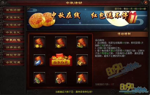 Ø 活动期间,玩家每在线满30分钟,即可获得一次抽取红包的机会;