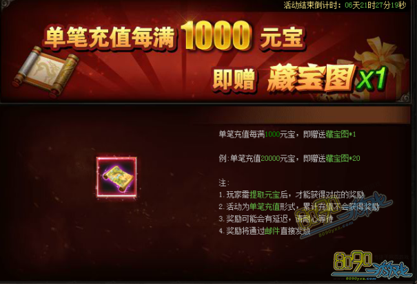 活动期间,单笔充值每满1000元宝,即可获赠藏宝图*1