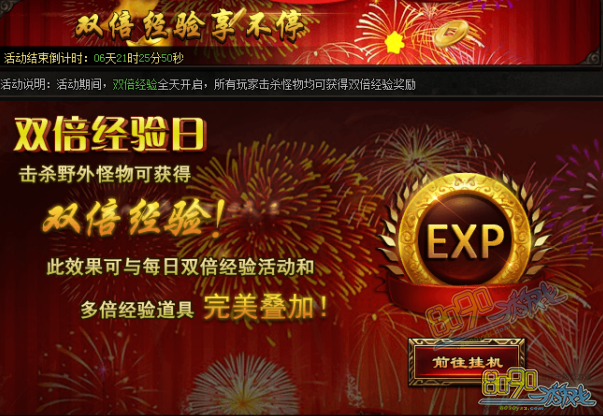 活动内容:活动期间,双倍经验全天开启,急速升级爽歪歪!