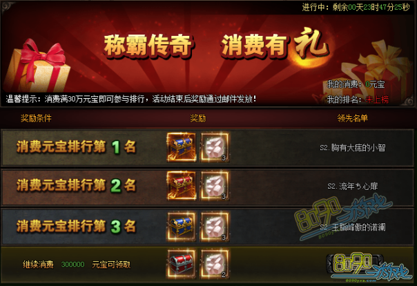 活动内容:活动期间,消费满30万元宝即可参与排行,活动结束后,奖励通过邮件发放。