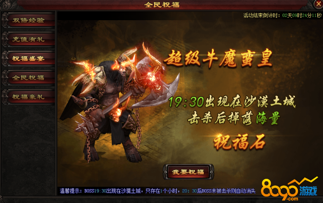 活动期间,每天晚上19:30将在沙漠土城刷新超级牛魔蛮皇,击杀后会掉落海量祝福石。