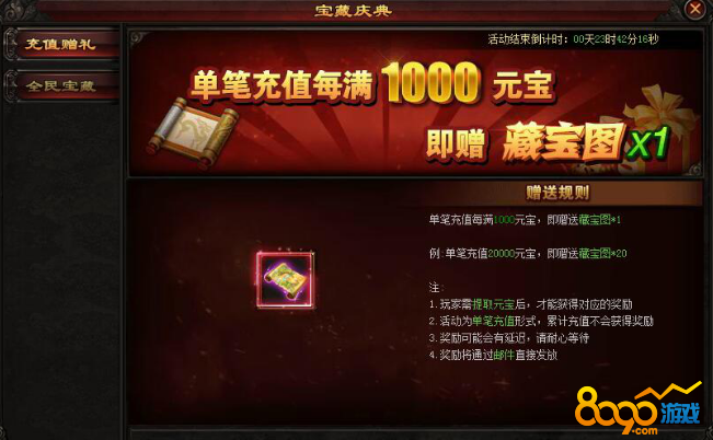 活动期间,单笔充值每满1000元宝,即可获赠藏宝图*1