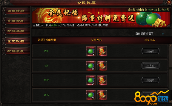 活动期间,获得祝福值达到一定数量,即可领取对应奖励