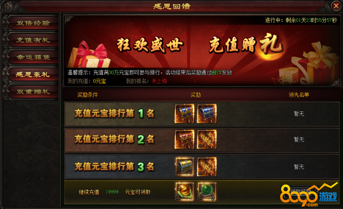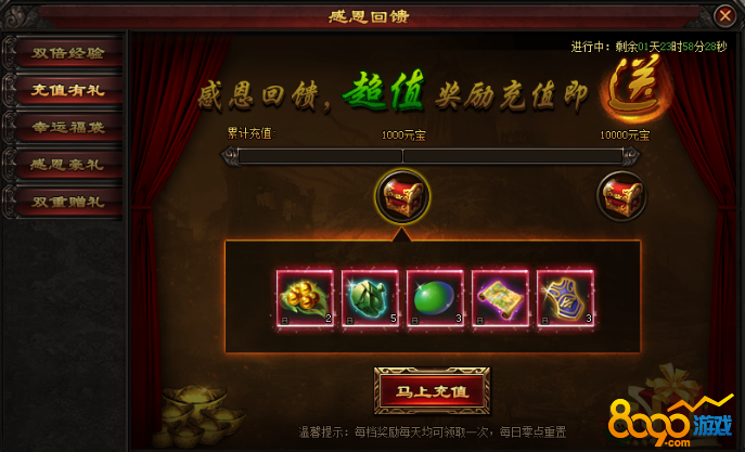活动期间,充值指定金额的元宝,即可领取超值奖励回馈哦!