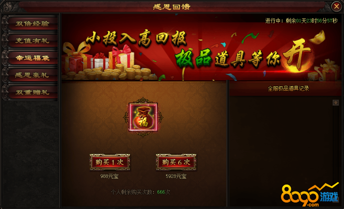 活动期间,玩家可花费少量元宝购买超值道具,机不可失,失不再来哦!