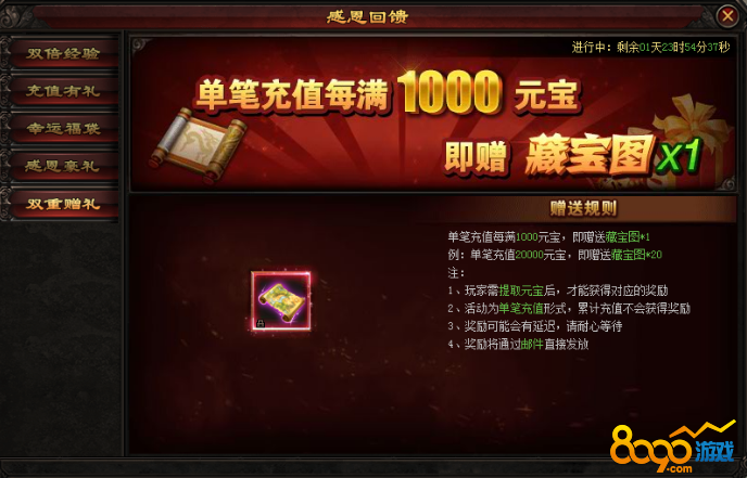 活动期间,每充值1000元宝即可获得藏宝图*1,多充多送,不计上限!