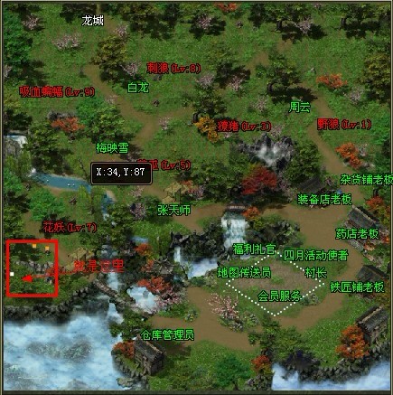 就是这里,作为新手任务地图第一不会有高手来,第二红框内的地方基本没有野怪怪物的,这样就为玩家们打神螺提供了一个绝对OK的环境。而且此地图到开区3天之后基本上就连人影都看不到一个了,所以小编在这里推荐要做神剑神甲的玩家们到此处来召唤神螺。