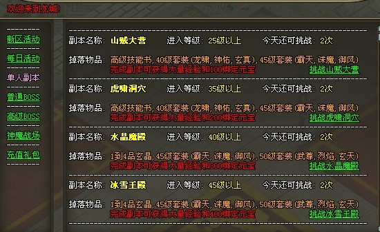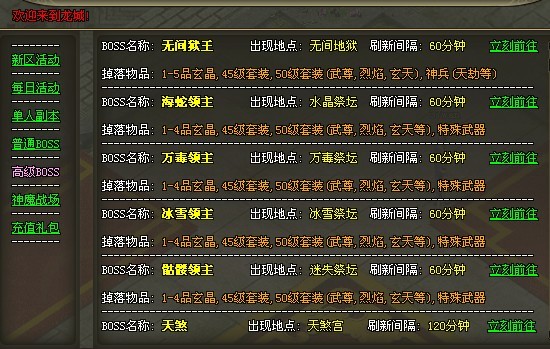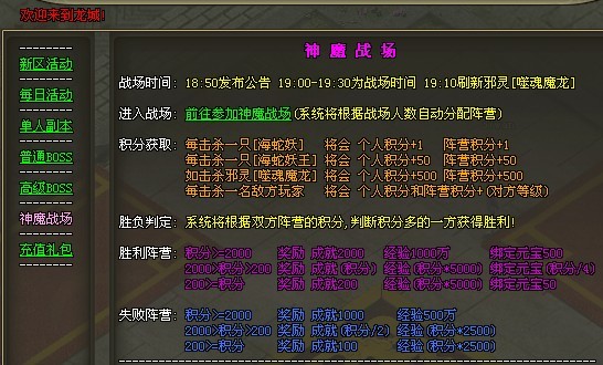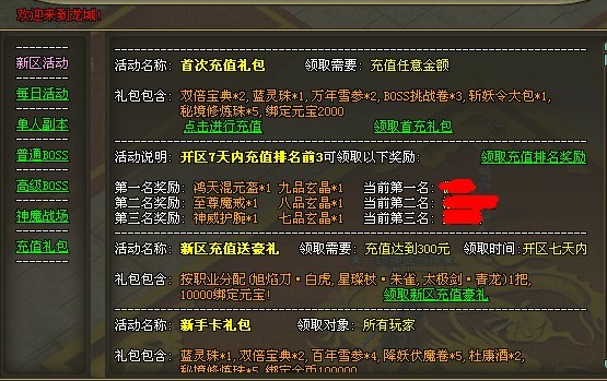 新区活动、每日活动、单人副本、普通BOSS、高级boss、神魔战场、充值礼包。