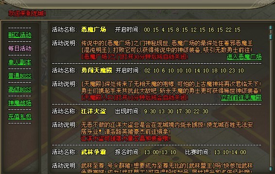 每日活动,里面有说明了游戏中一天必须做的活动时间,恶魔广场、勇闯天魔殿、江洋大盗、武林争霸、地狱炎魔、双倍时间,要在游戏中活动自如,摸准时间战斗,记得看这个表了;