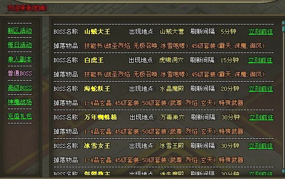 普通副本里详细的写明了BOSS出现的地方,会有爆的装备,还有多长时间刷新一次;