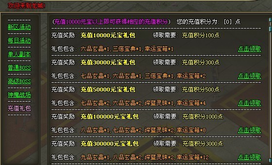 充值礼包,充值有对应的积分,拥有积分能换取丰厚的礼包噢,积分累积8.9铁不在是梦。拥有10铁也不是奢求的事。