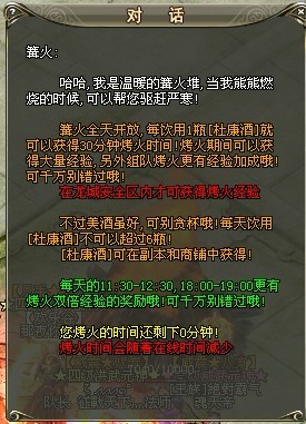 每天的11:30~12:30 18:00~19:00是双倍烤火时间,这个时间玩家们可以去吃饭什么的休息一下。烤火需要喝杜康酒,每瓶半小时的功效,一天最多可以喝六瓶,喝多了就没有用了,只有在安全区里面才可以获得经验,组队烤火队员越多经验越高。