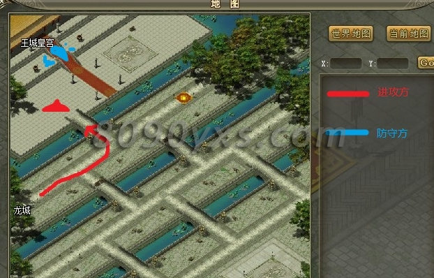 进入王宫的通道只有一个,所以建议在龙城里集合人之后跑图去王宫地图,其实并不远,然后慢慢推进,一般防守一方很少会在皇宫外面布防太多,除非他们的人很多。我们这边需要在王宫门前的广场上再次集结一次。刚才那些权当是热身了。首先观察对方有没有在通道上堵人,没有堵门的情况下,我们不妨去堵一下门。