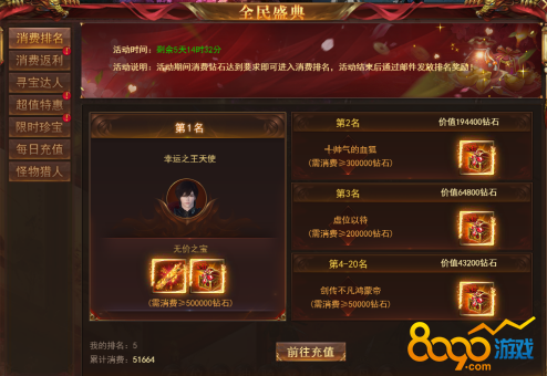 【说明】活动期间消费达到相应条件即可进入排名,活动结束后根据排名发放奖励!具体奖励以游戏内为准!