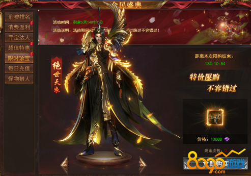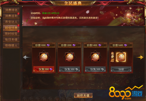 【说明】活动期间每天可购买超值优惠道具,购买达到一定条件还有免费送的极品道具,每天会更换不同的道具,机不可失!