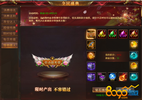 【说明】活动期间击杀怪物获得积分,积分可进行抽奖,积分不足时也可以消耗钻石进行抽奖。每天24点重置积分和抽奖次数!