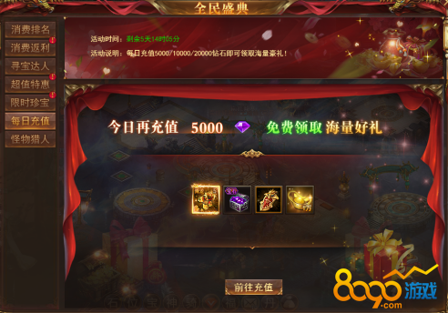 【说明】每日充值5000/10000/20000钻石可领取海量豪礼!3个充值档次!