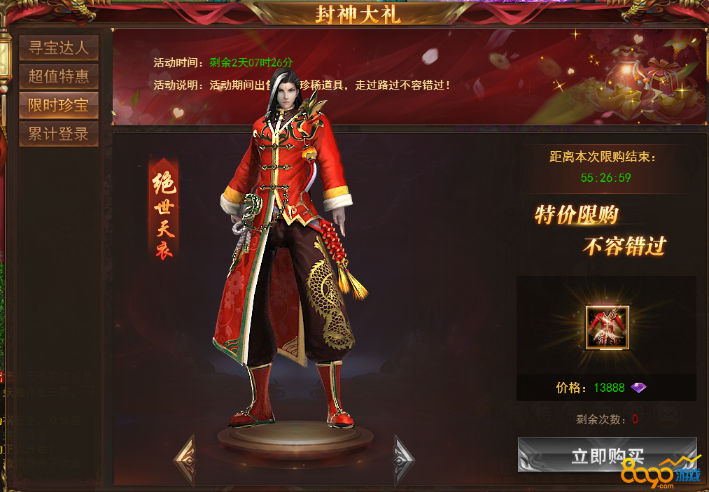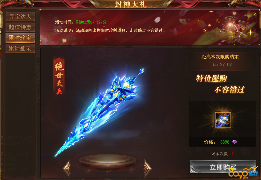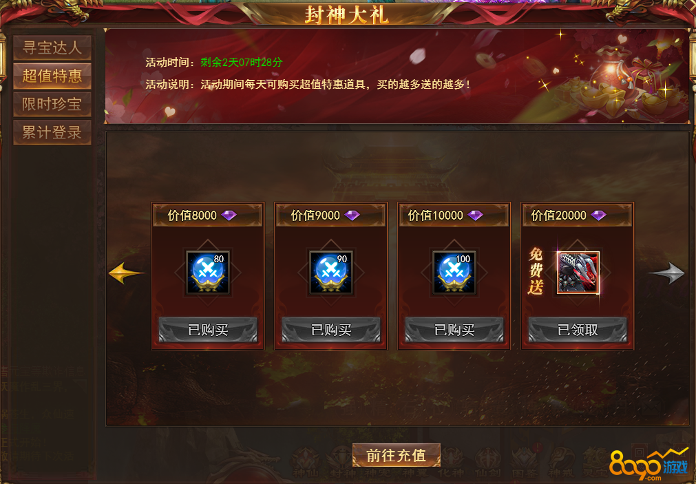 【说明】活动期间每天可购买超值优惠道具,购买达到一定条件还有免费送的极品道具,每天会更换不同的道具,机不可失!