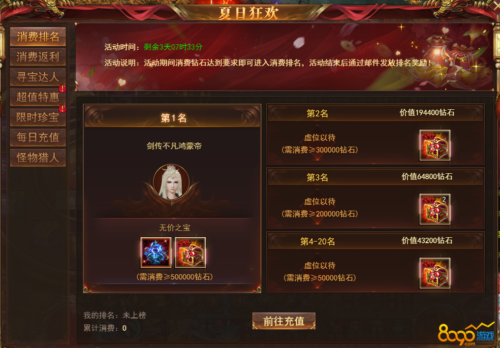 【说明】活动期间消费达到相应条件即可进入排名,活动结束后根据排名发放奖励!具体奖励以游戏内为准!