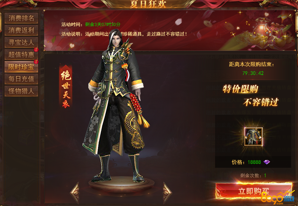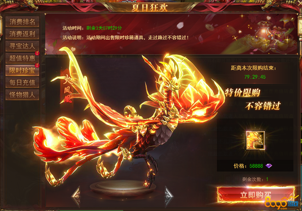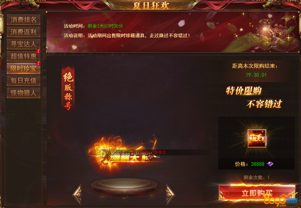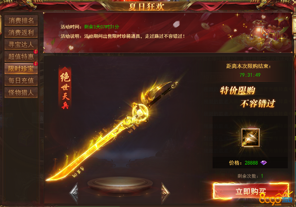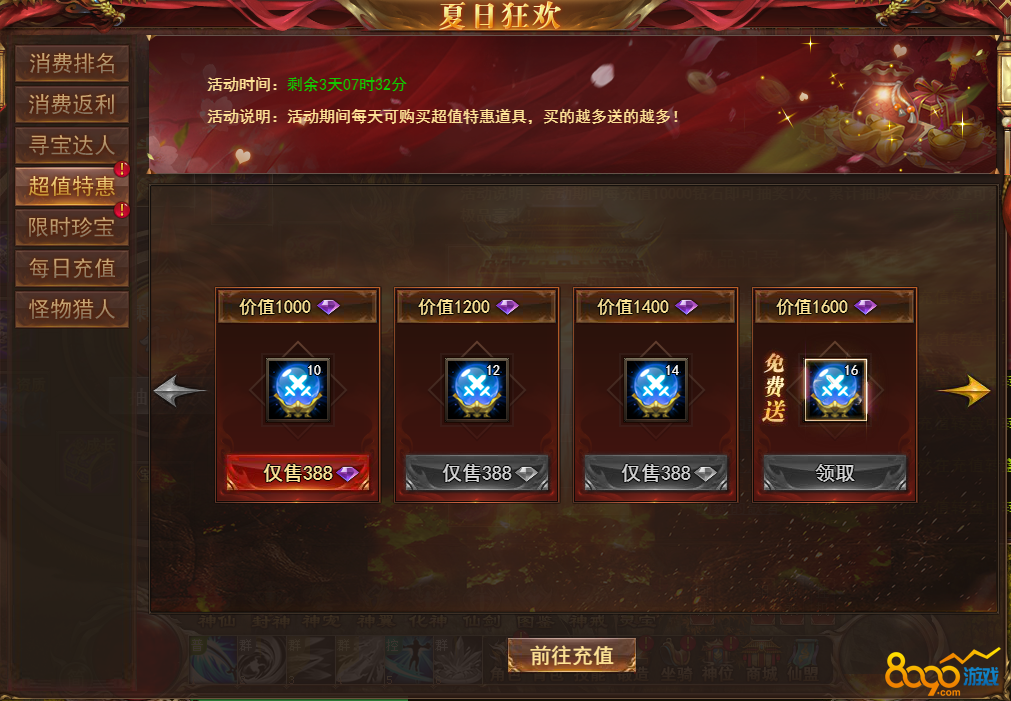 【说明】活动期间每天可购买超值优惠道具,购买达到一定条件还有免费送的极品道具,每天会更换不同的道具,机不可失!