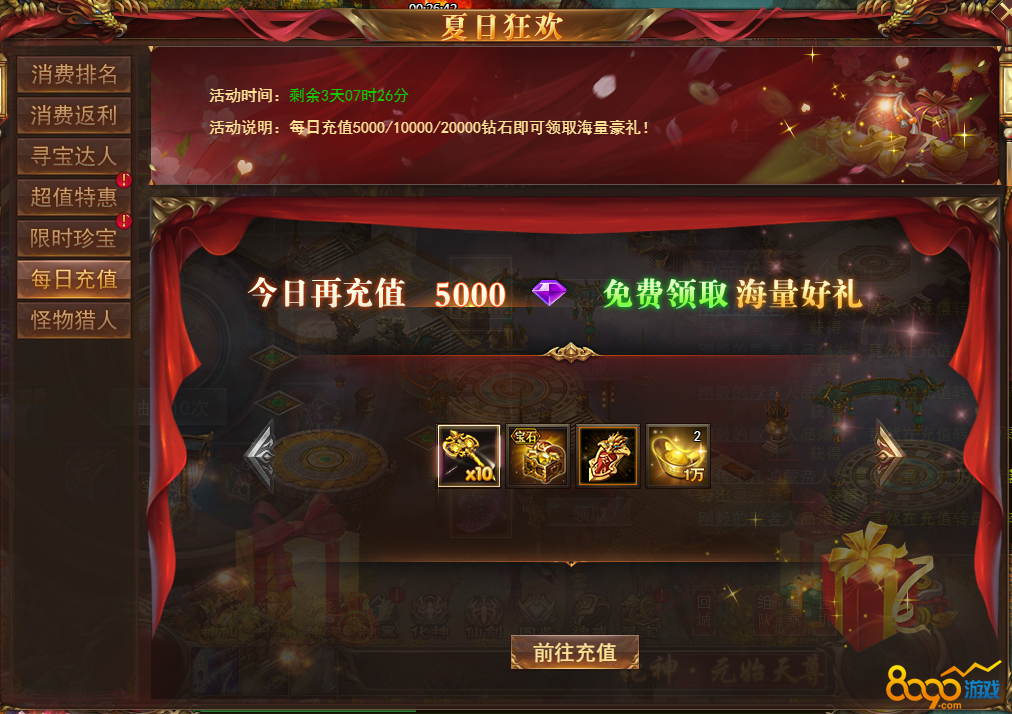 【说明】每日充值5000/10000/20000钻石可领取海量豪礼!3个充值档次!