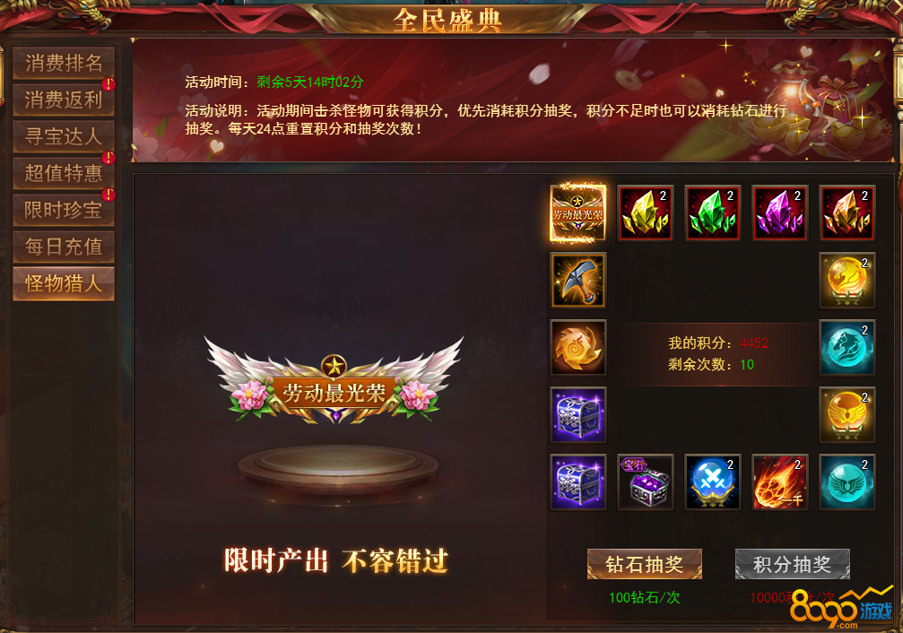 【说明】活动期间击杀怪物获得积分,积分可进行抽奖,积分不足时也可以消耗钻石进行抽奖。每天24点重置积分和抽奖次数!