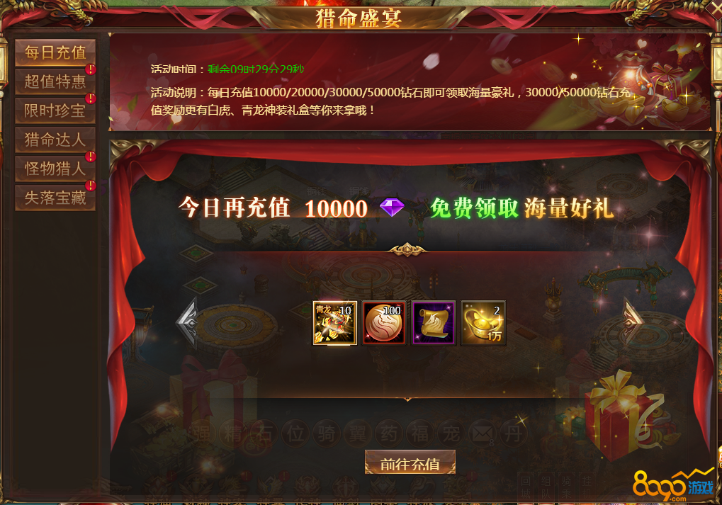 【说明】每日充值10000/20000/30000/50000钻石即可领取海量豪礼,30000/50000钻石充值奖励更有白虎、青龙神装礼盒等你来拿哦!