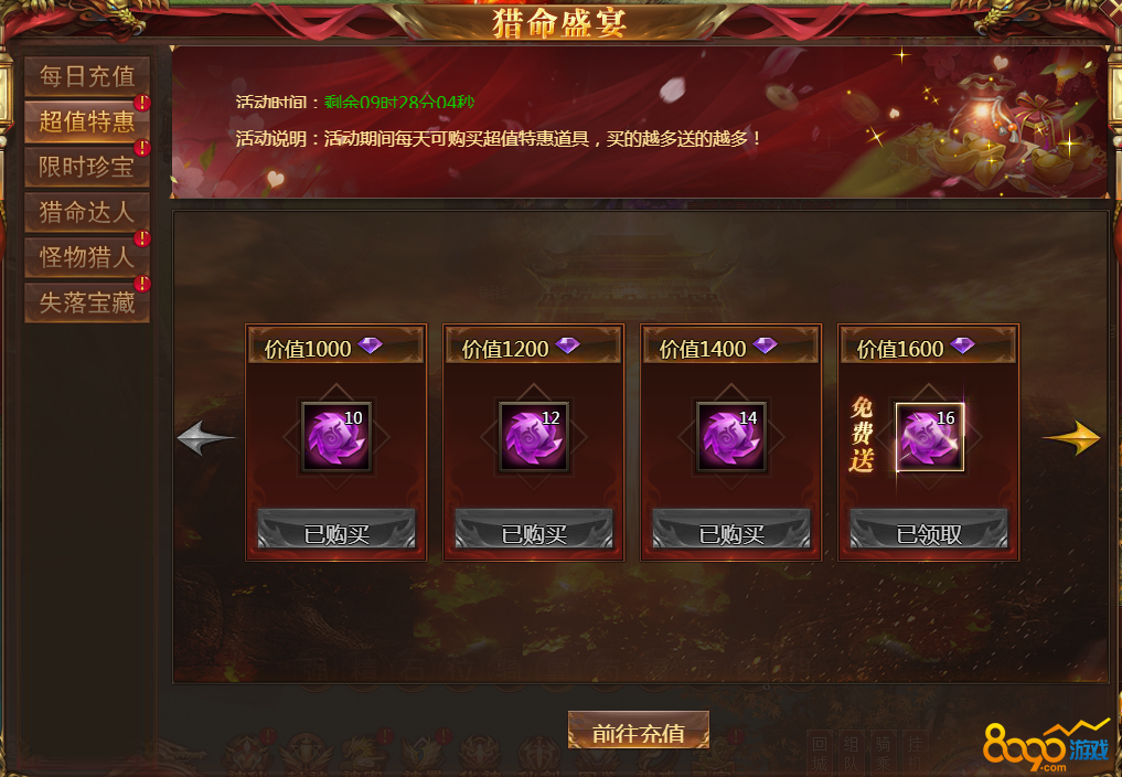 【说明】活动期间每天可购买超值特惠道具,买的越多送的越多!