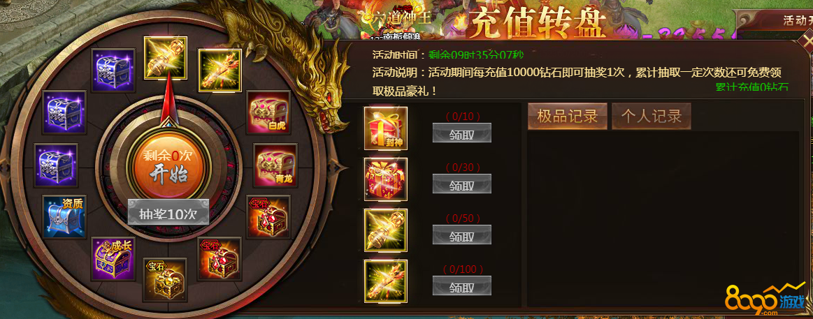 【说明】活动期间每充值10000钻石即可抽奖一次,累计抽取一定次数还可免费领取极品豪礼!