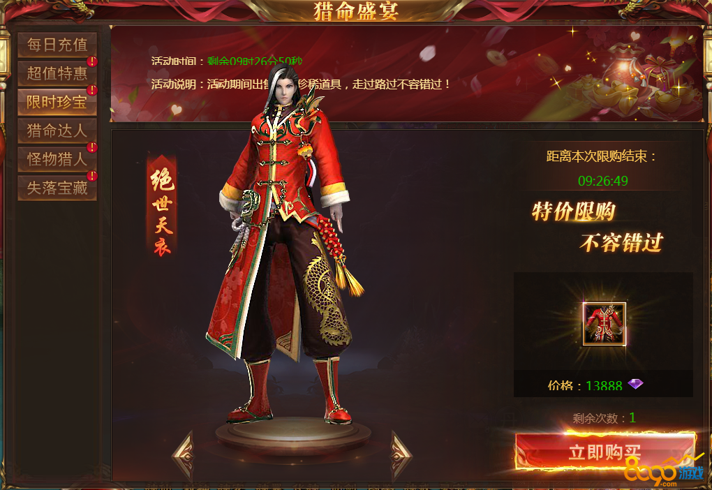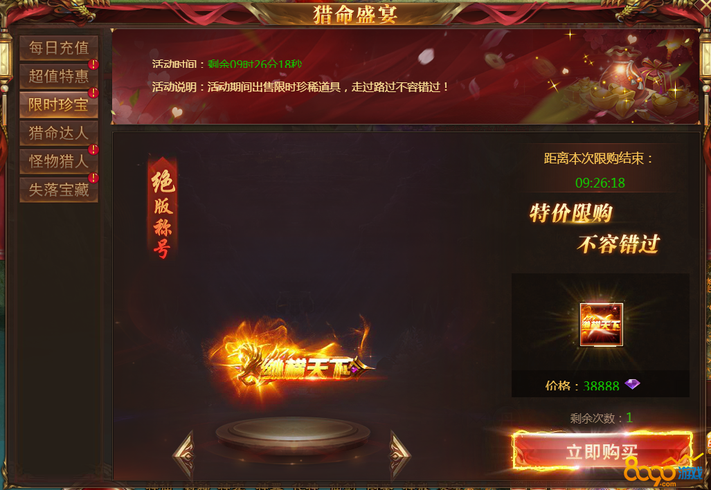 【说明】活动期间钻石猎命达到相应次数,即可免费领取极品大礼!限时9折猎命,不容错过!