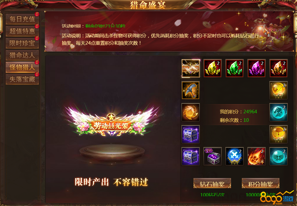 【说明】活动期间击杀怪物可获得积分,优先消耗积分抽奖,积分不足时也可以消耗钻石进行抽奖。每天24点重置积分和抽奖次数!