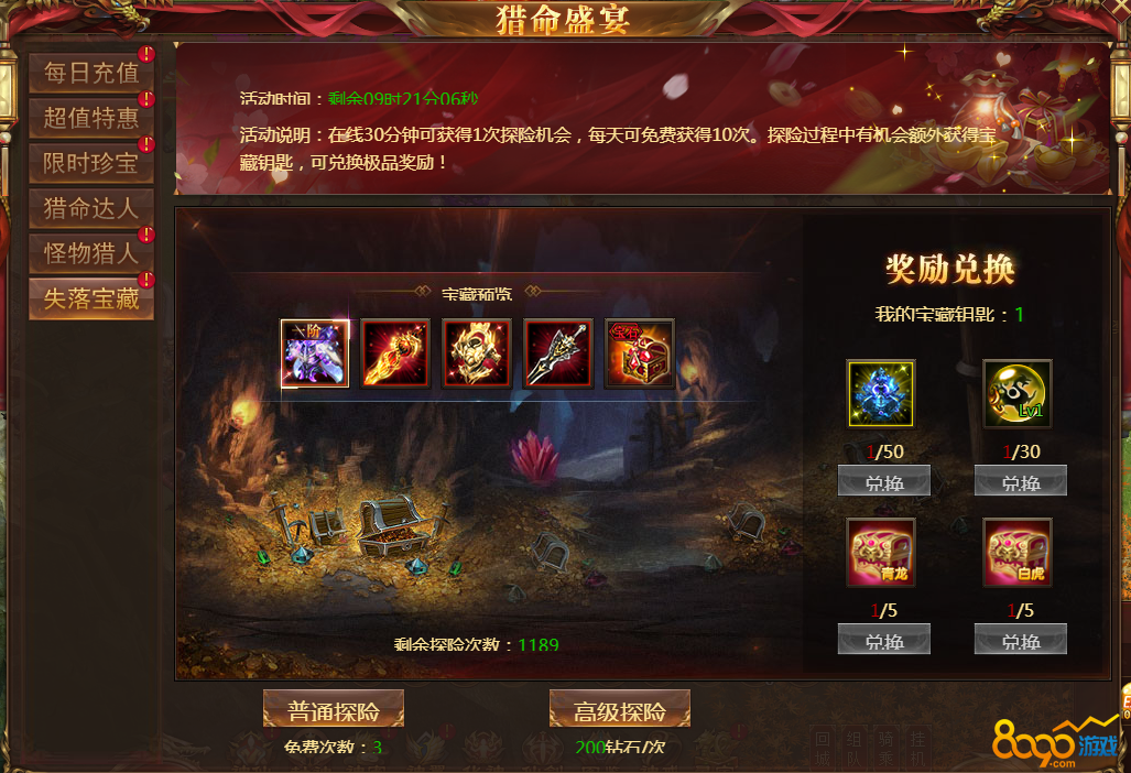 【说明】在线30分钟可获得1次探险机会,每天可免费获得10次。探险过程中有机会额外获得宝藏钥匙,可兑换极品奖励!