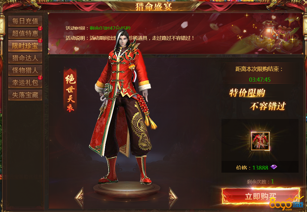 【说明】活动期间钻石猎命达到相应次数,即可免费领取极品大礼!限时9折猎命,不容错过!