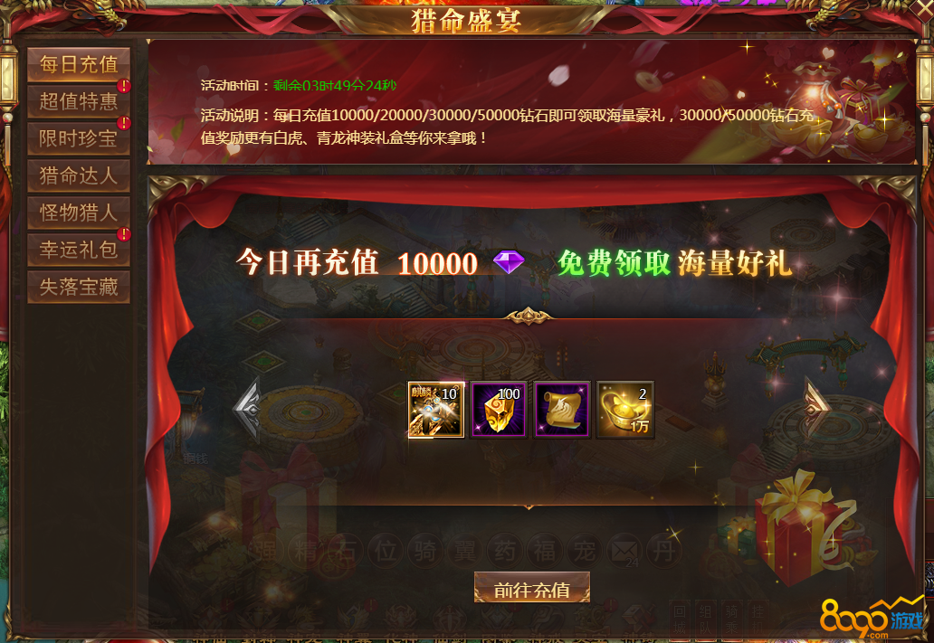 【说明】每日充值10000/20000/30000/50000钻石即可领取海量豪礼,30000/50000钻石充值奖励更有白虎、青龙神装礼盒等你来拿哦!