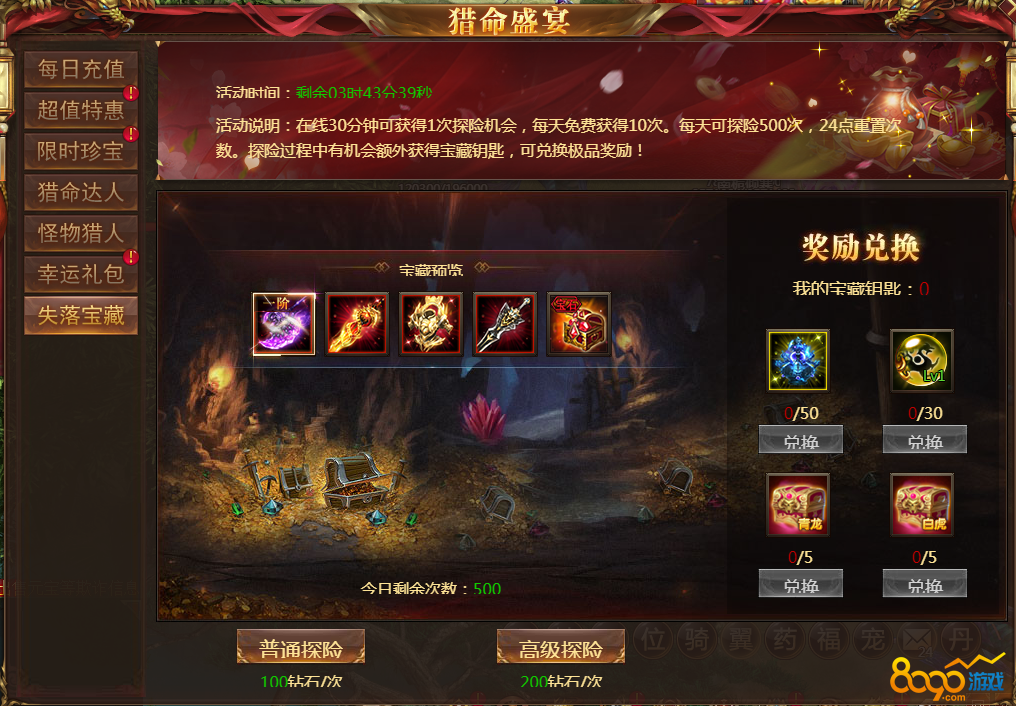 【说明】在线30分钟可获得1次探险机会,每天可免费获得10次。每天可探险500次,24点重置次数。探险过程中有机会额外获得宝藏钥匙,可兑换极品奖励!
