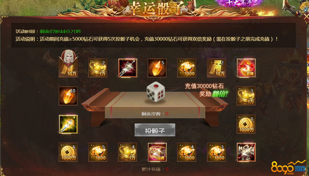 【说明】活动期间消费钻石≥5000钻石可获得5次投骰子机会,充值30000钻石可获得双倍奖励(需在投骰子之前完成充值)!