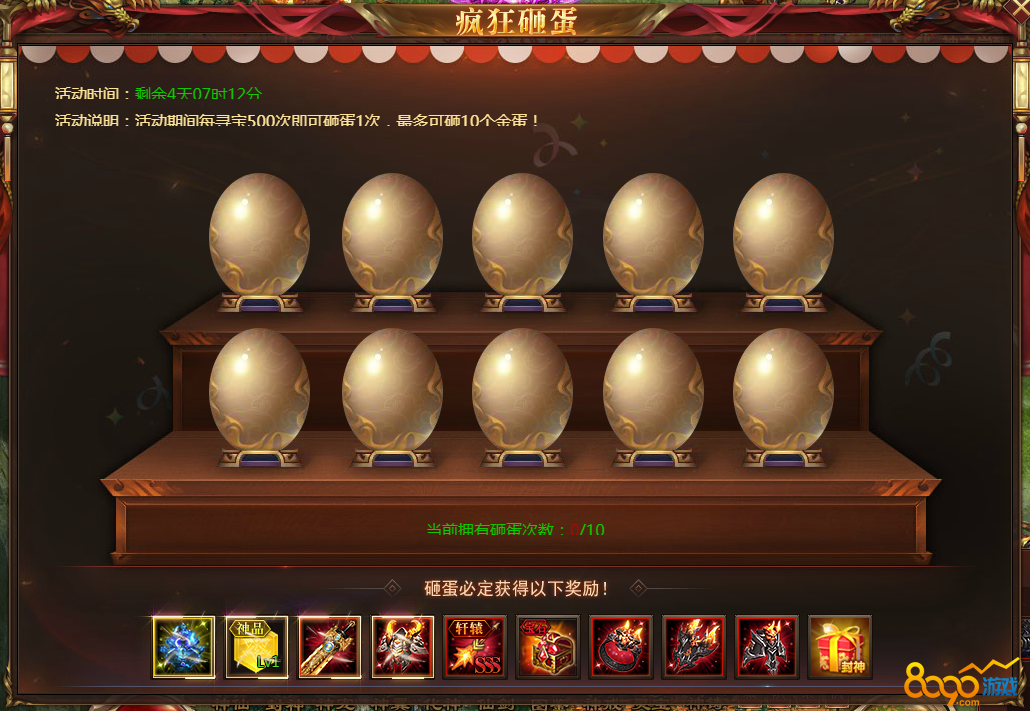 【说明】活动期间每寻宝500次即可砸蛋1次,最多可砸10个金蛋!
