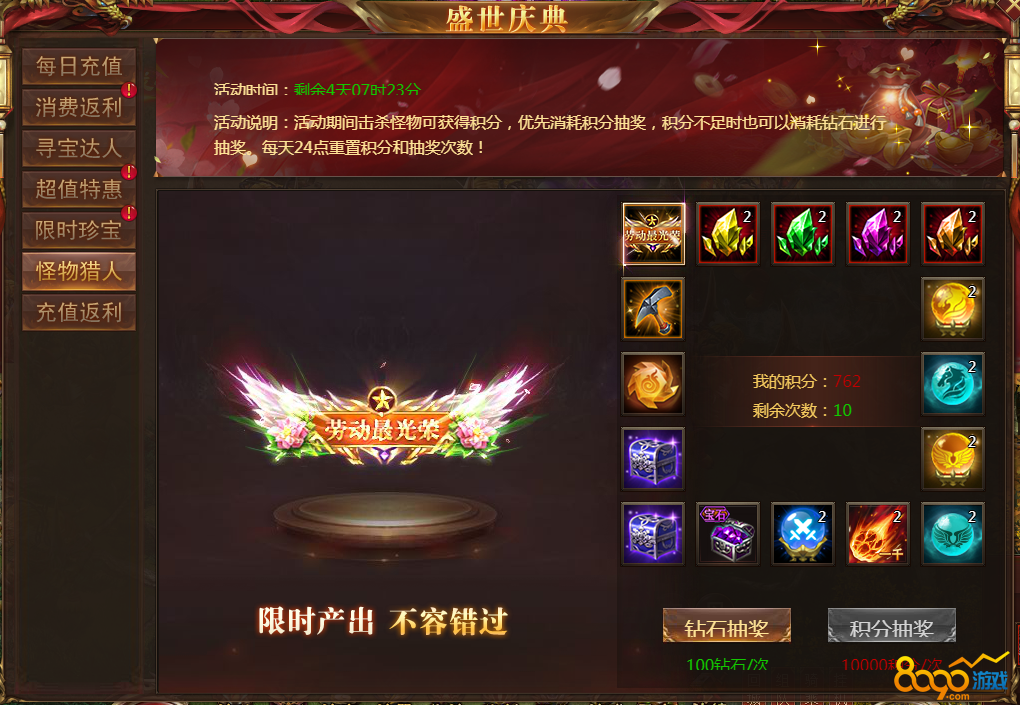 【说明】活动期间击杀怪物可获得积分,优先消耗积分抽奖,积分不足时也可以消耗钻石进行抽奖。每天24点重置积分和抽奖次数!