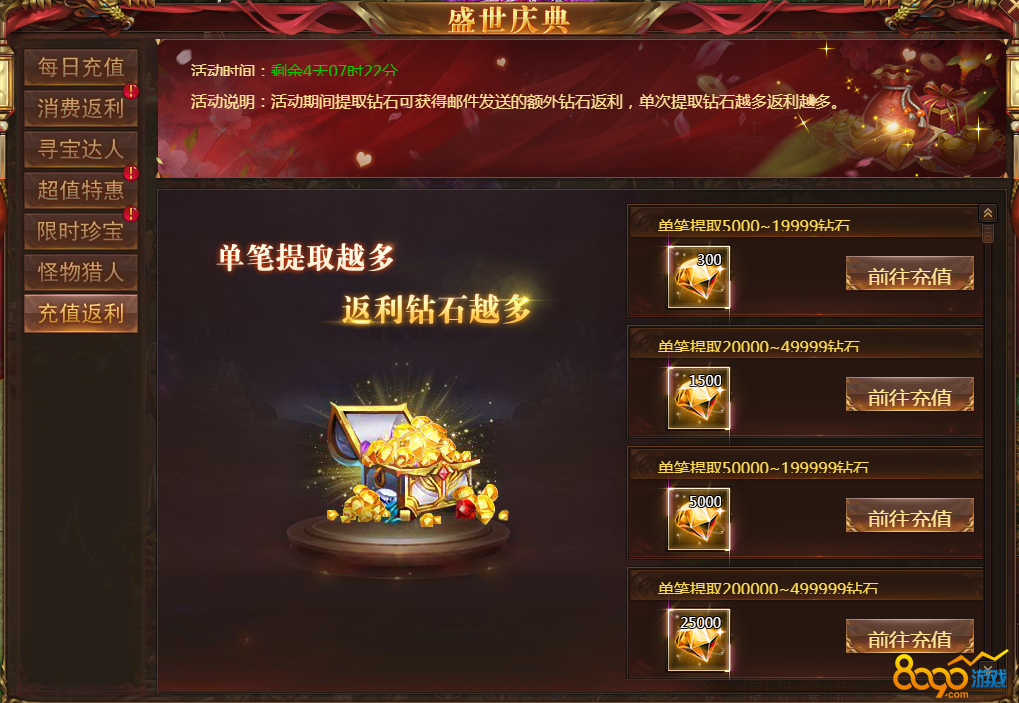 【说明】活动期间提取钻石可获得邮件发送的额外钻石返利,单次提取钻石越多返利越多!