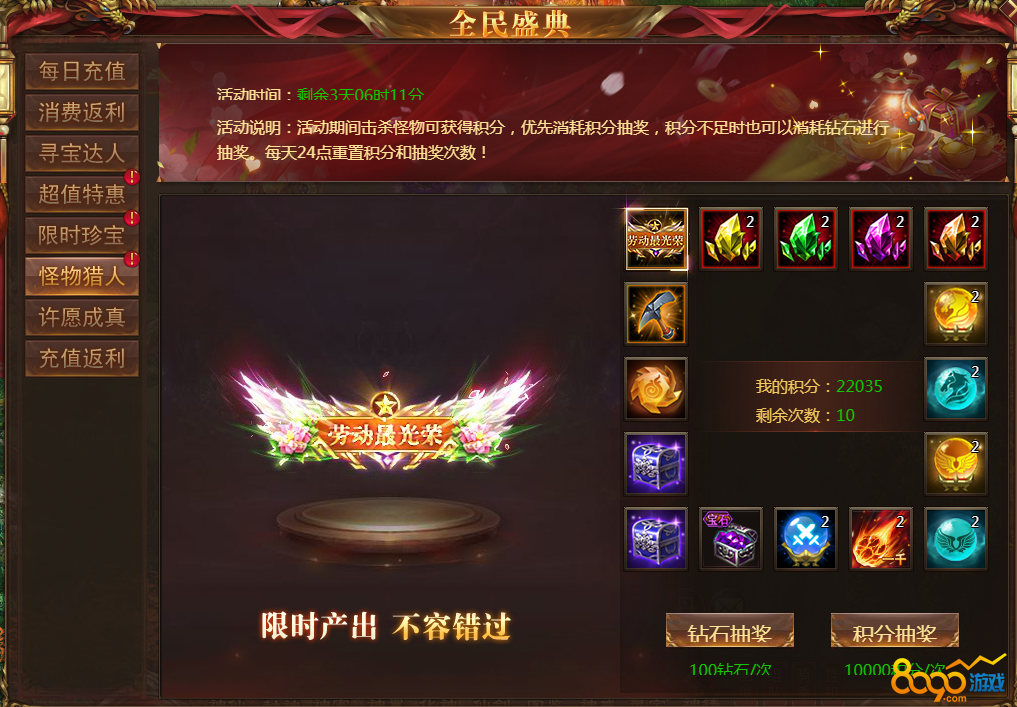 【说明】活动期间击杀怪物可获得积分,优先消耗积分抽奖,积分不足时也可以消耗钻石进行抽奖。每天24点重置积分和抽奖次数!