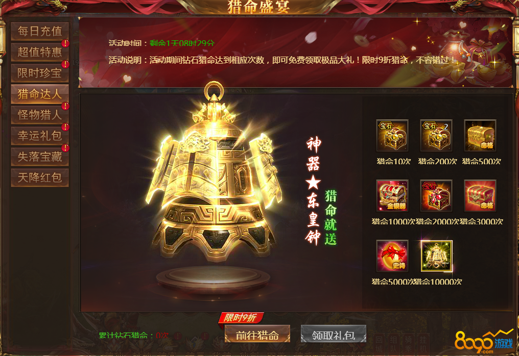 【说明】活动期间钻石猎命达到相应次数,即可免费领取极品大礼!限时9折猎命,不容错过!