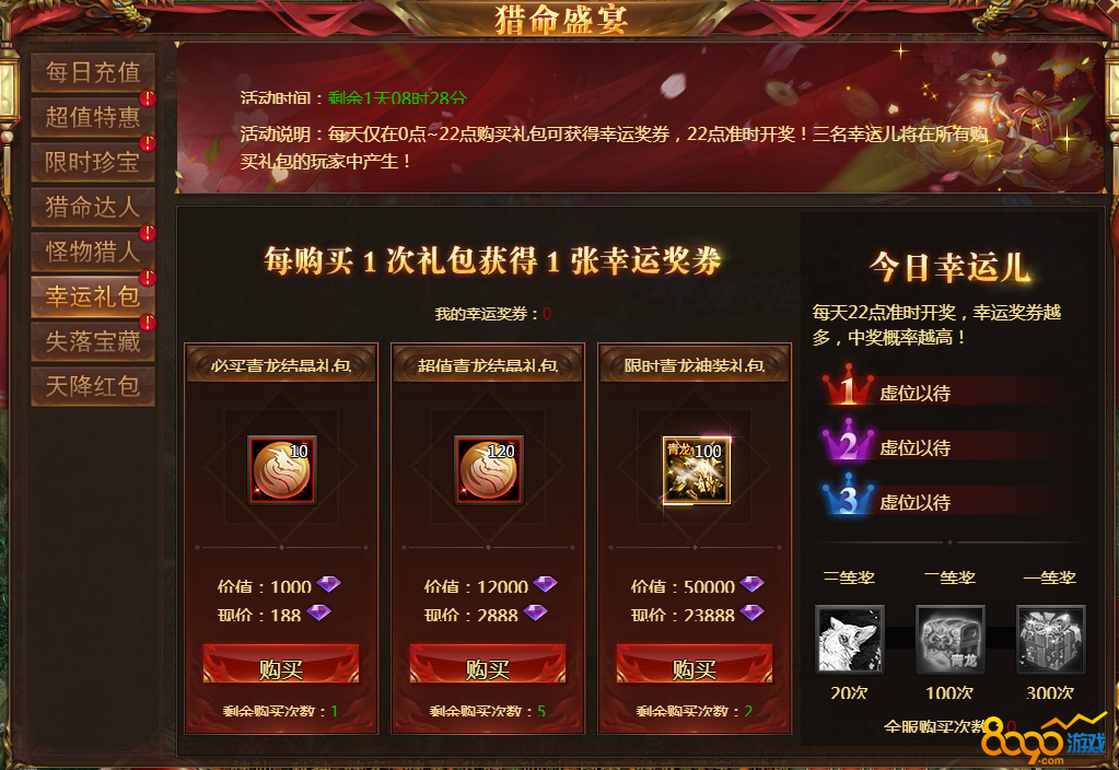 【说明】每天仅在0点~22点购买礼包可获得幸运奖券,22点准时开奖!三名幸运儿将在所有购买礼包的玩家中产生!